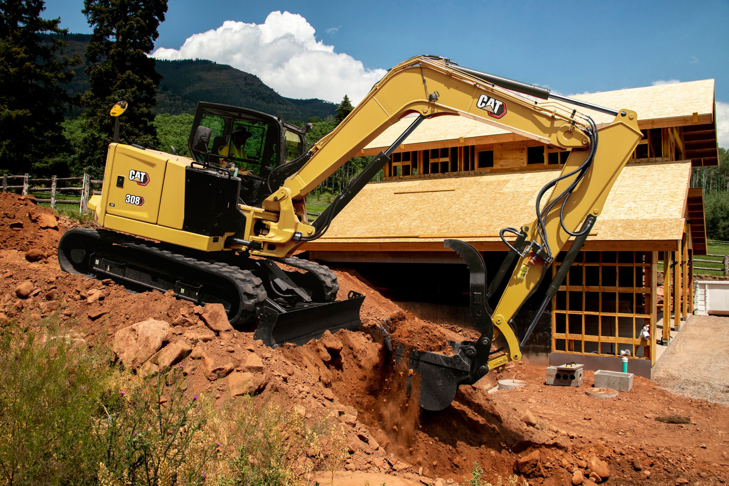 The CAT® 308 CR Mini Hydraulic Excavator delivers high performance, durability and versatility in a compact design to help you work in a variety of applications.